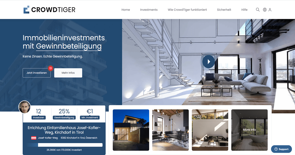 CrowdTiger ist eine innovative internationale Finanzierungsplattform für Immobilienprojekte. Bei CrowdTiger sammeln Immobilienentwickler, Bauträger, Immobiliengesellschaften und Privatleute für Immobilienprojekte Kapital von Investoren. Unterschied zu bestehenden Crowdinvesting-Plattformen: Der Anleger erhält, anstatt von Zinsen, eine Beteiligung am Gewinn des Immobilienprojektes.