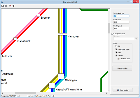 Für die Ausgabe kann der Liniennetzplan in die gewünschte Größe skaliert werden. Da der Liniennetzplan dabei komplett neu gezeichnet wird, können die sonst oft entstehenden Qualitätseinbußen – beispielsweise unscharfe Ränder – verhindert werden.